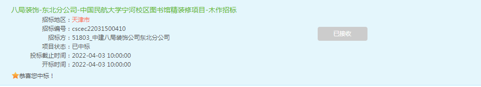 中建八局装饰工程有限公司招标项目中国民航大学新校区建设及老校区更新改造工程一标段施工项目精装修工程,中标结
